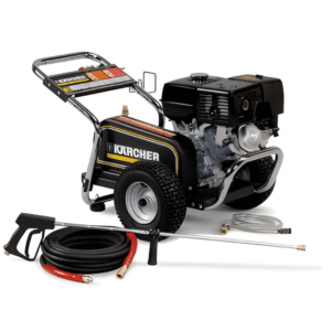 This cold water commercial pressure washer is designed with a powder coated steel chassis, chrome handles and frame, flat-free tires and a 7-year industrial Kärcher crankcase pump. The cast iron belt pulley system and reliable Honda GX engine delivers cleaning volume up to 3.0 GPM. ETL certified to UL-1776 safety standards.